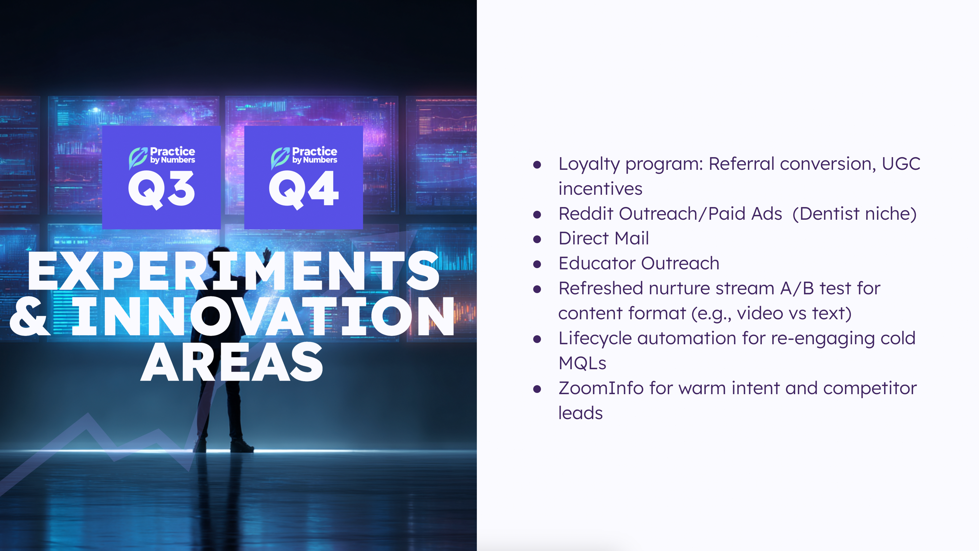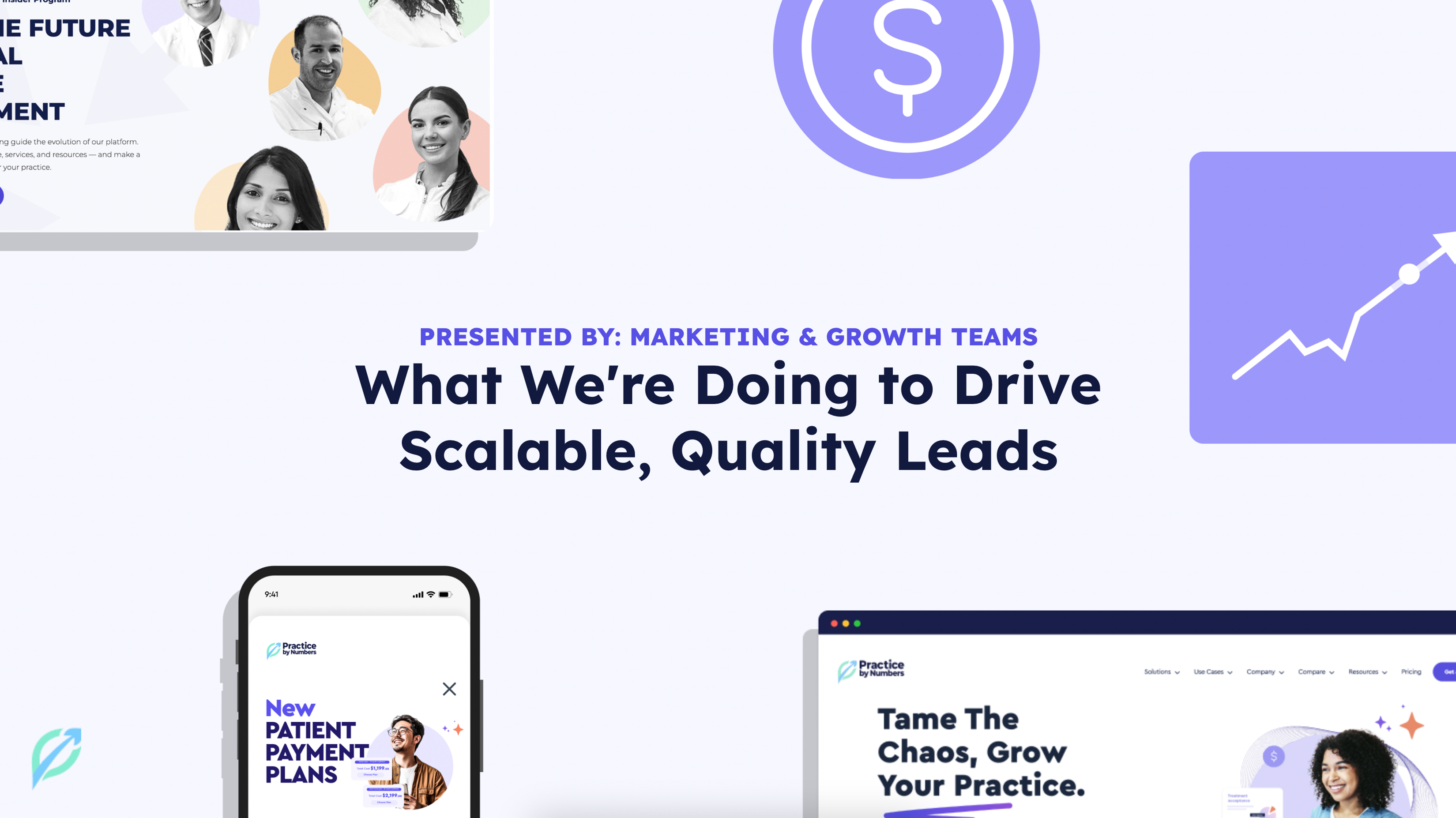 This project reimagined the Practice by Numbers pitch deck from a traditional presentation into a high-impact marketing asset designed to support sales conversations and leadership presentations. Beginning with funnel strategy and messaging hierarchy, we structured the narrative to clearly articulate the challenges, opportunities, and value behind the company’s growth initiatives. We then developed a crisp visual system — typography, iconography, layouts, and device mockups — to make data and product positioning feel accessible, polished, and results-focused. The final deck equips the Marketing & Growth teams with a scalable, on-brand presentation that communicates clarity, confidence, and momentum.
